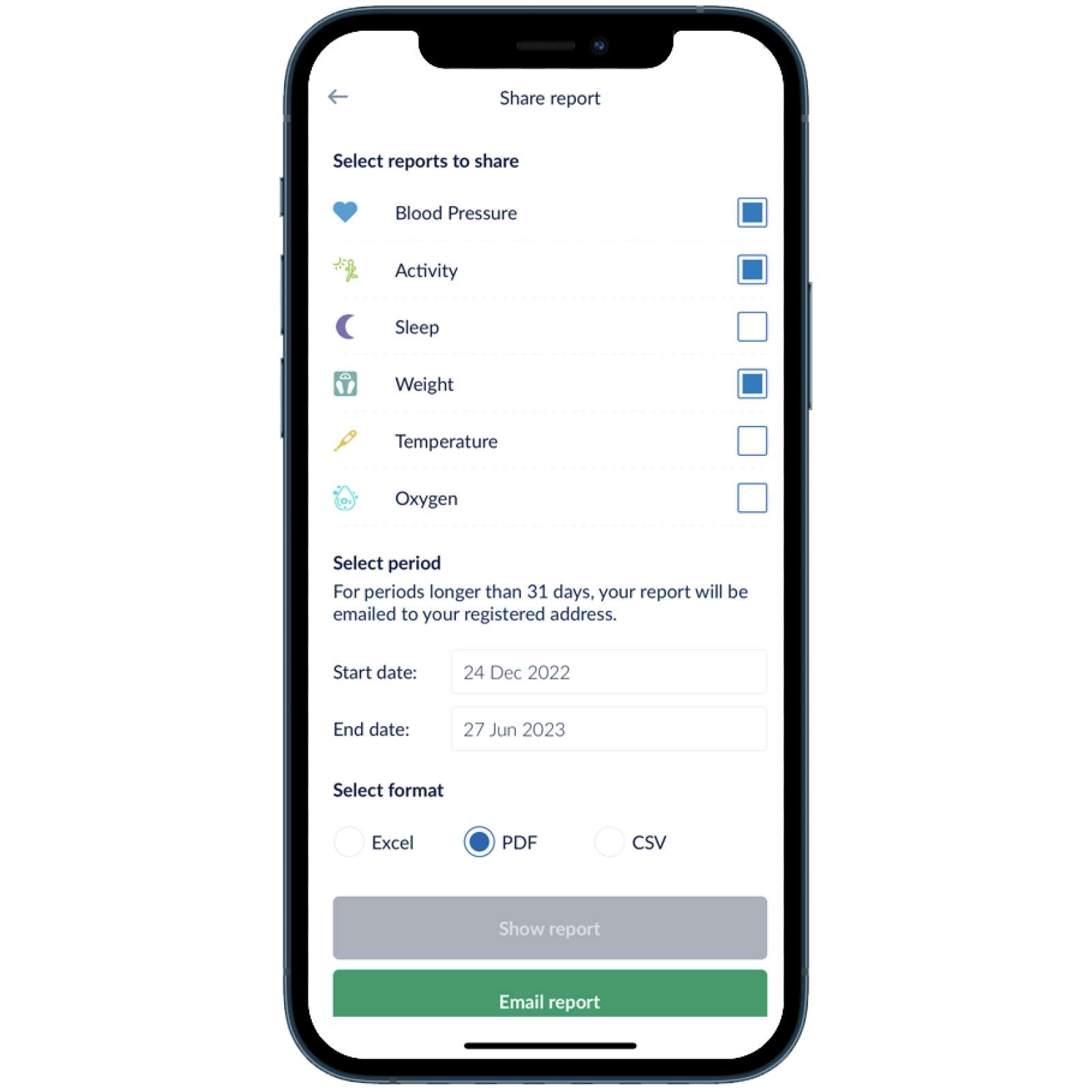 Приложението OMRON connect Ви дава възможност да се ориентирате във всички данни. Можете да проследявате тенденции, да наблюдавате напредъка си и лесно да споделяте данните за здравето си или да експортирате резултатите си за използване в други приложения.